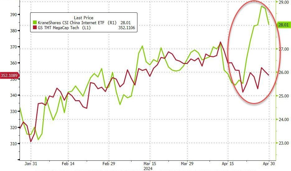 4 月份,中概股大幅跑贏美國科技股,中證全球中國互聯網指數 4 月累計上漲 9.5%,高盛 TMT Megacap Tech 指數累計下跌 2%。