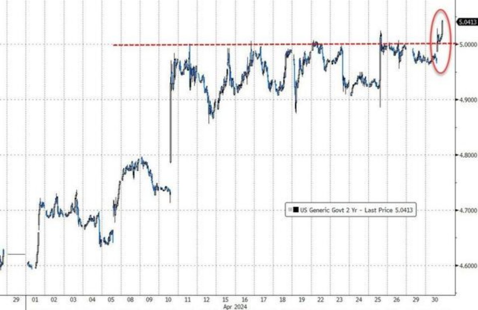 美債收益率一路走高,10 年期和 2 年期美債收益率在 4 月份分別累計上升 48 個基點和 42 個基點,後者已經站上 5% 的關鍵心理關口。