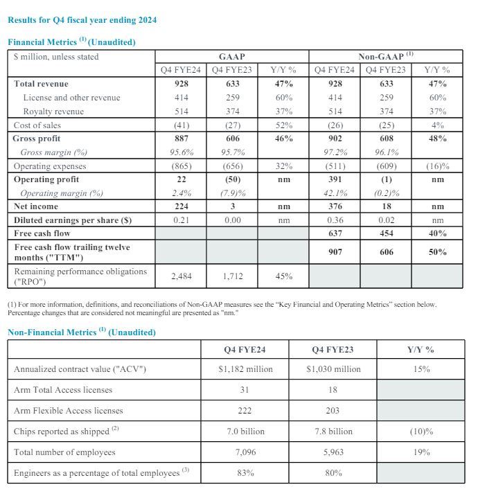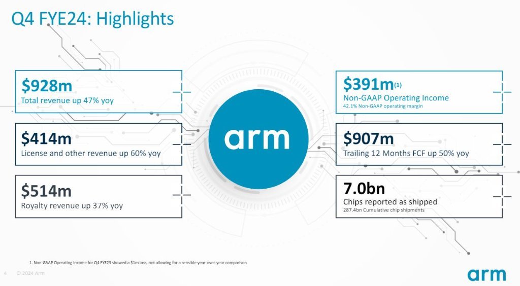 分析可知,Arm 超越了公司自己预期的 2024 财年第四财季和全年业绩指引。此前曾预计第四财季的收入在 8.5 亿至 9 亿美元,区间中点等于同比增长 38%,调整后每股收益 0.28 至 0.32 美元;2024 财年总收入同比增近 19% 至 31.8 亿美元,将全年盈利指引从每股 1.05 美元上调至 1.22 美元。