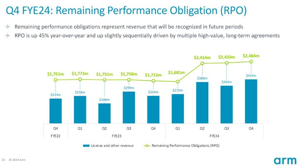 截至 2024 自然年一季度末,在多项高价值许可协议的推动下,公司的剩余履约义务(Remaining performance obligations,即未履行合同的总价值)同比增长 45% 至 24.84 亿美元,上季度曾增长 38% 至 24 亿美元。季度内新增 4 项 AI 专用芯片全面许可协议(Arm Total Access ,ATA)。