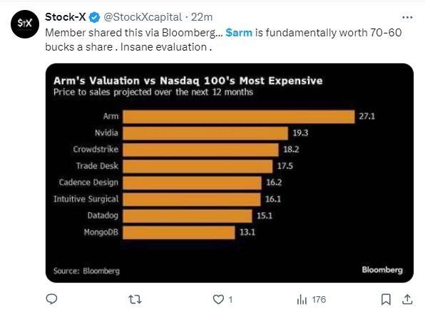 不过,Arm 目前是纳斯达克 100 指数中估值最为昂贵的芯片股,甚至超过了 AI 计算硬件需求的最大受益者英伟达。按照不同口径统计,Arm 的估值是未来 12 个月预计销售额的 27 倍,英伟达则为 19 倍,Arm 的估值还是预期盈利能力的 82 倍。