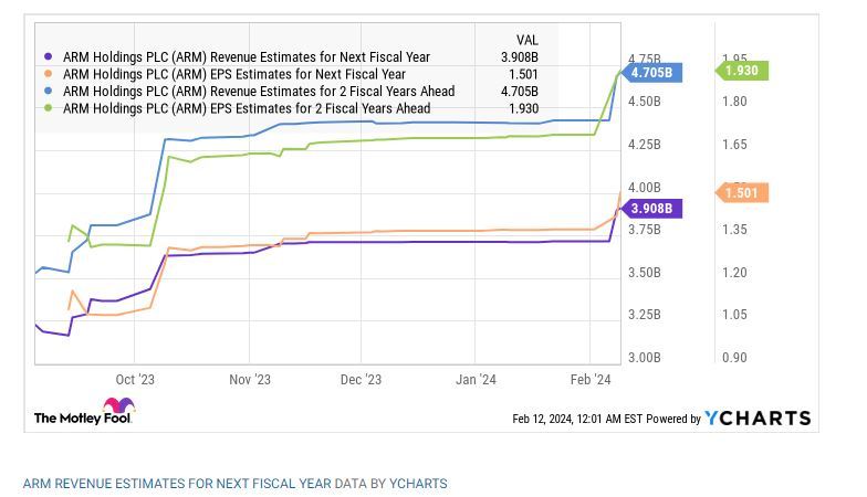 华尔街普遍认为,Arm 将从人工智能芯片不断增长的需求中获益匪浅,预计未来几年的营收和利润将持续强劲增长,例如未来五年盈利以年均 41% 的速度增长,股价则存在 77% 的上行空间。