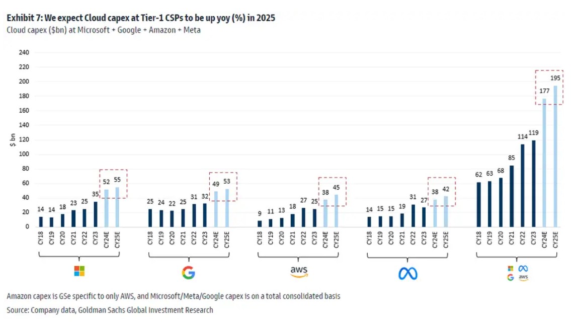 高盛預計,微軟、谷歌、亞馬遜旗下 AWS、Facebook 母公司 Meta 這四家大型科技公司今年在雲計算方面的資本投入高達 1770 億美元,遠遠高於去年的 1190 億美元,而 2025 年將繼續增至驚人的 1950 億美元。