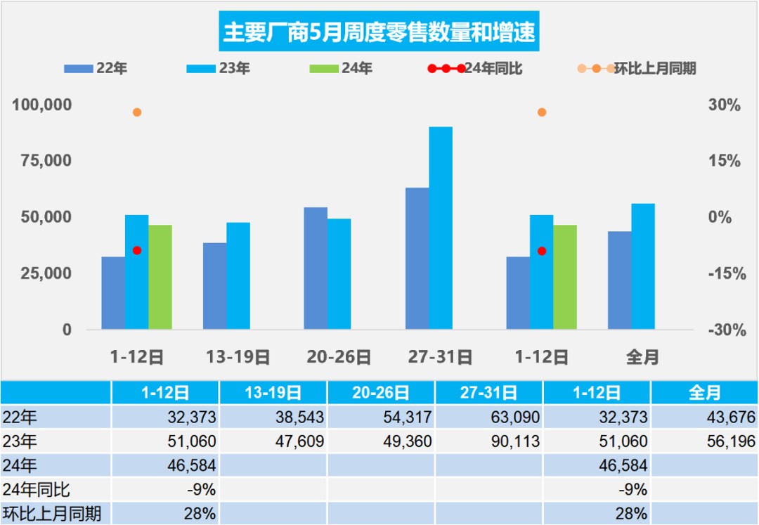 5 月 1-12 日,乘用車市場零售 55.9 萬輛,同比去年下降 9%,較上月同期增長 28%。今年以來累計零售 692.6 萬輛,同比增長 6%。
