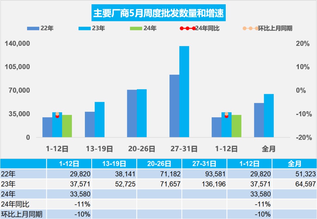 5 月第一週批發日均 3.4 萬輛,同比去年同期下降 11%,環比上月同期下降 10%。