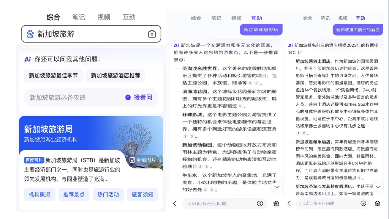 目前,百度已約有 11% 的搜索結果由 AI 生成,可為用户提供更準確、更有組織、更直觀的回答。同時,百度近期已在搜索中增加了 “互動” 欄,完全改為問答式搜索,種種動作都表明,AI 重構搜索的速度在加快。