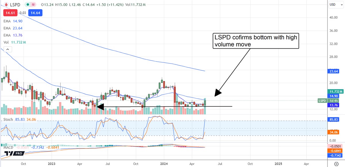 Katapult NASDAQ: KPLT operates a lease-to-own platform in the US. The share price dived in 2021 and hit new lows this year, but looks ready to start moving higher now. The FQ1 results include 18% top-line growth, better-than-expected GAAP losses, and favorable guidance for Q2. The company expects growth to continue in Q2 if at a slower 10% pace, supported by expanding the client base and growing share among existing merchants. That combination is expected to accelerate the top-line growth in the coming quarters.Risks for this market include a lack of interest. There is only one analyst following it, Loop Capital and the last update is over six months old. The price target issued in September 2023 is $20, about 15% above the current action, but there is little to no market conviction to support it. Institutions own about 27%, suggesting a lack of conviction, and sellers outpace buyers this year. The market surged on the news but hit resistance above the $20 target and quickly reversed. The market now shows significant resistance that may not be broken without another solid catalyst.