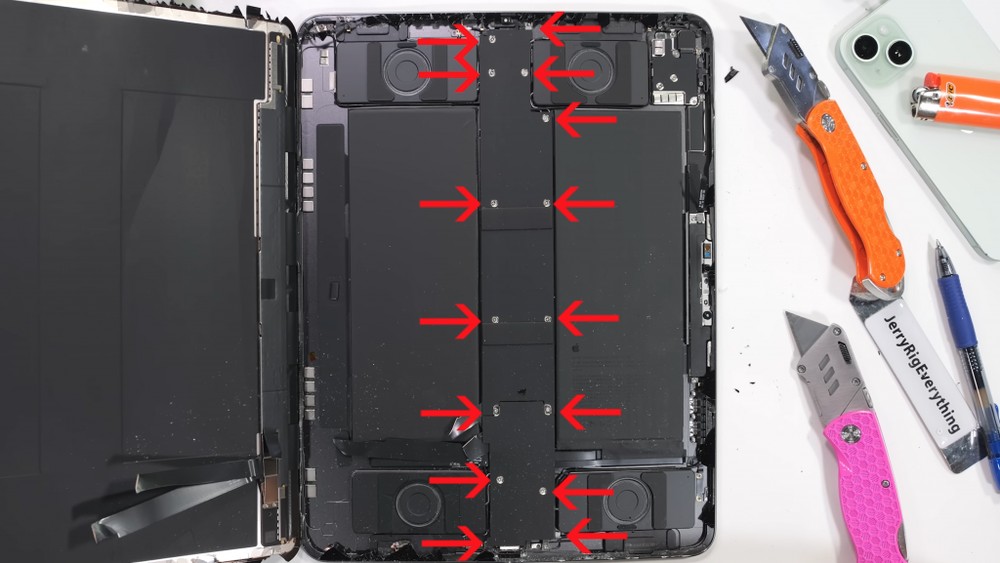 從 JerryRigEverything 視頻中的拆解來看,確實能看到在 iPad Pro 內部,有一條金屬蓋橫跨了整台 iPad。