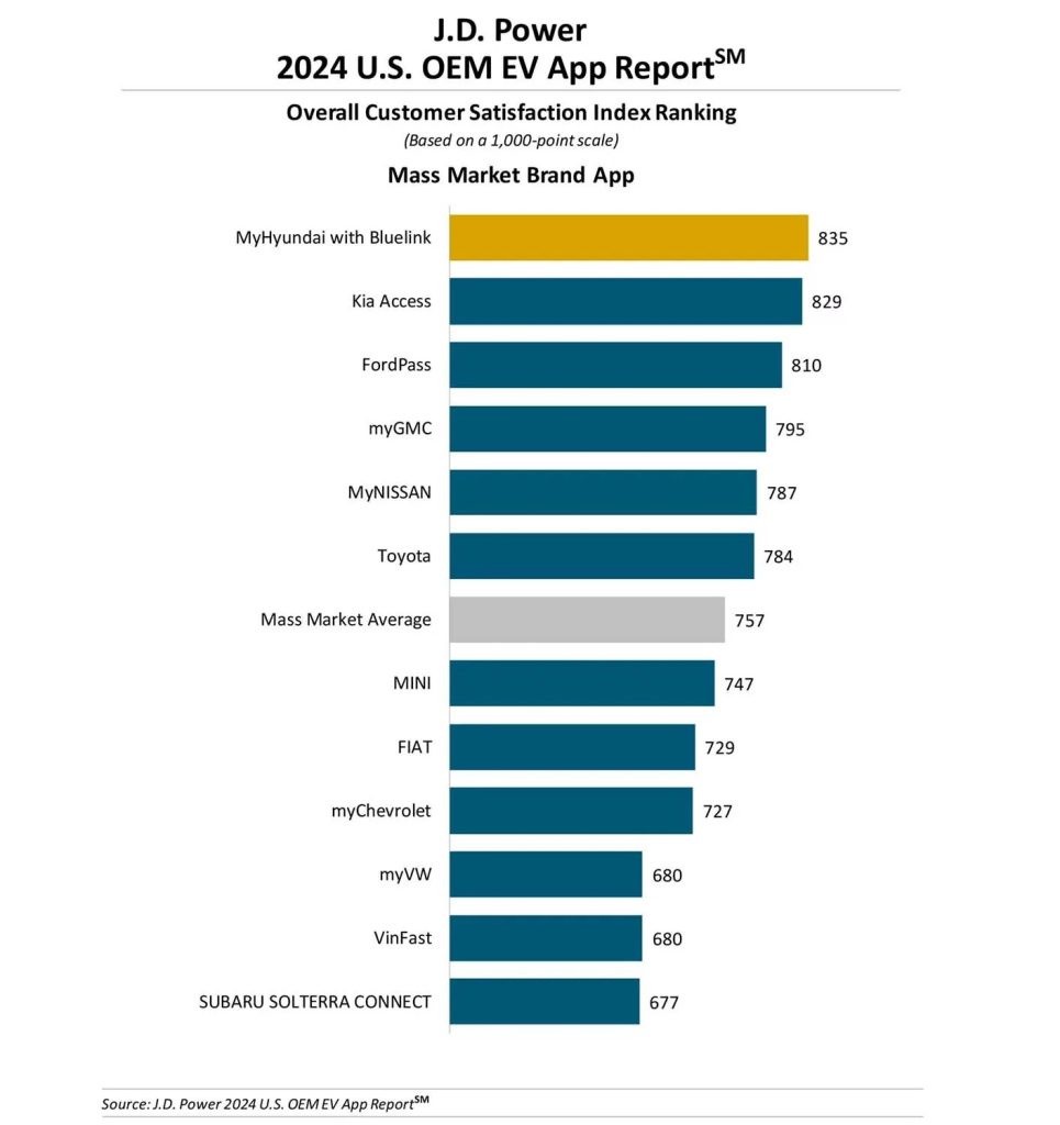 梅賽德斯 - 奔馳的 Mercedes me connect 以 843 分的總分位居第二,寶馬的 My BMW 應用以 834 分的總分位居第三。現代的 MyHyundai with Bluelink 以 835 分的總分位居該研究的大眾品牌應用排名榜首。
