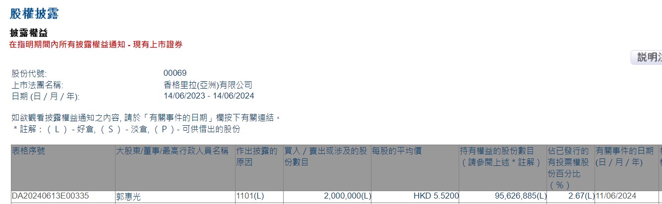 香港聯交所最新資料顯示,6 月 11 日,執行董事郭惠光增持香格里拉 (亞洲) 200 萬股,每股作價 5.52 港元,總金額為 1104 萬港元。增持後最新持股數目約為 9562.69 股,最新持股比例為 2.67%。補充:Box 24, Box 27 and Box 32: The shares under the codes of 2305 and 5102 were held through discretionary trusts of which Ms KUOK Hui Kwong is a discretionary beneficiary. Box 24: The transaction was an internal transfer from other member of Kuok Group.