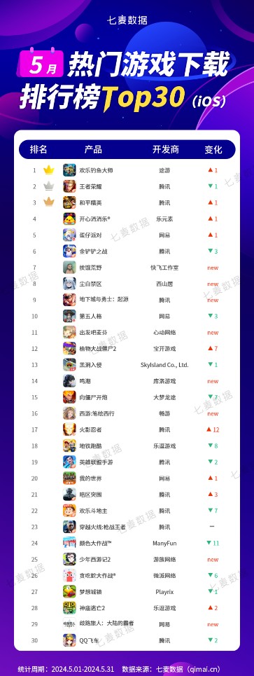 Zhitong Finance APP learned that recently, Qimai Data released the May 2024 popular game rankings, including the Top 30 popular game download list and the Top 30 popular game revenue list. In the popular game download list, the Top 1 has changed to the "new face", which is the recently launched "Joyful Fishing Master" under Tuyoo in the past two months, with Top 2 and 3 being Tencent's (00700) classic mobile games "Honor of Kings" and "Peace Elite".