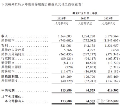 Zhito Finance APP noted that as the first brand in China to promote the concept of "ancient gold," Lao Pu Gold has elevated its performance to unprecedented heights before listing. The prospectus shows that the company achieved a revenue of RMB 3.18 billion in 2023, a year-on-year increase of 145.7%; and a net profit of RMB 416 million, a year-on-year increase of 340.5%.
