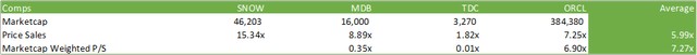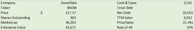 請注意,股票數量是 Snowflake 的非 GAAP 稀釋流通股數。 Snowflake 的交易價格是 TTM 銷售額的 15.34 倍,相對於同類企業資料儲存競爭對手而言具有溢價。
