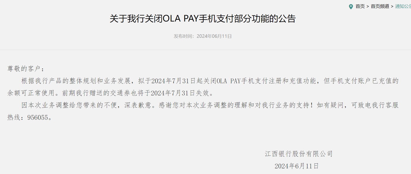 Jiangxi Bank Limited announced today that as part of its overall product line planning and business development strategy, it will make significant adjustments to the OLA PAY mobile payment platform starting from July 31, 2024. This adjustment involves the closure of the registration and recharge functions of the OLA PAY mobile payment.