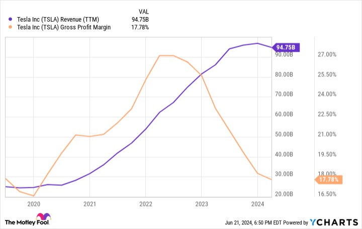 Investors should avoid getting lost in the clouds of potential. The reality is that Tesla's financial health today depends on it selling EVs, and business isn't great. Its revenue growth has stalled out despite price cuts that have cut into its profit margins.