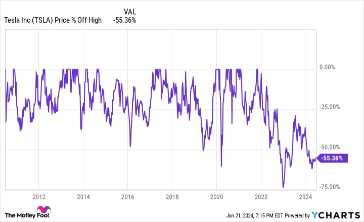 It's hard to call Tesla "cheap" trading at more than 74 times its estimated 2024 earnings, but cyclical stocks always look expensive during the falling parts of their cycles. Even with its volatile past, the reality is that this stock rarely drops more than 50% from its high.