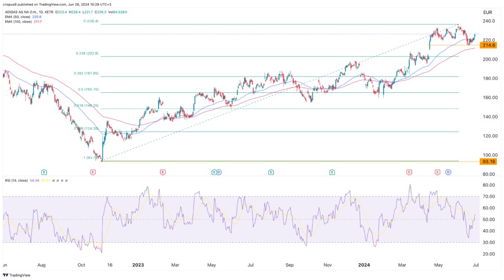 The daily chart shows that the Adidas stock price has rallied after bottoming at €93.15 in 2022. It has now soared to over €220 and moved above the key resistance point at €200.