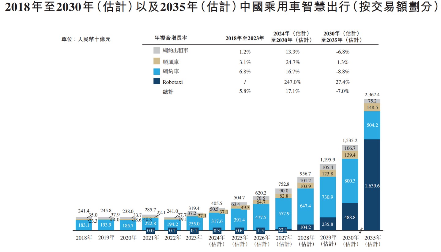 From an industry perspective, smart travel includes innovative solutions for ride-hailing, carpooling, ride-hailing taxis, and Robotaxi. According to Frost & Sullivan data, the market size of the industry in 2023 is 319.4 billion yuan. Despite the significant impact of the epidemic on travel from 2020 to 2022, the compound annual growth rate over the past five years remains positive, expected to reach 1.54 trillion yuan by 2030, with a compound annual growth rate of 17.1%.