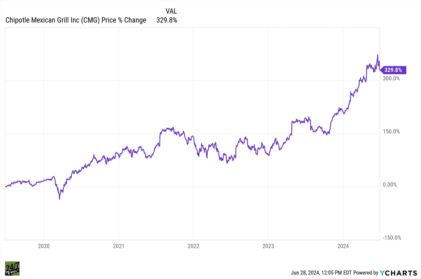 Chipotle 的 5 年股價圖表令人印象深刻,股價年均增長 70%,營業收入增加了五倍(從 3.36 億美元增至 16.3 億美元)。儘管管理層在 3 月宣佈了 50 比 1 的股票拆分,但直到 6 月 26 日的交易中,拆分才正式生效。