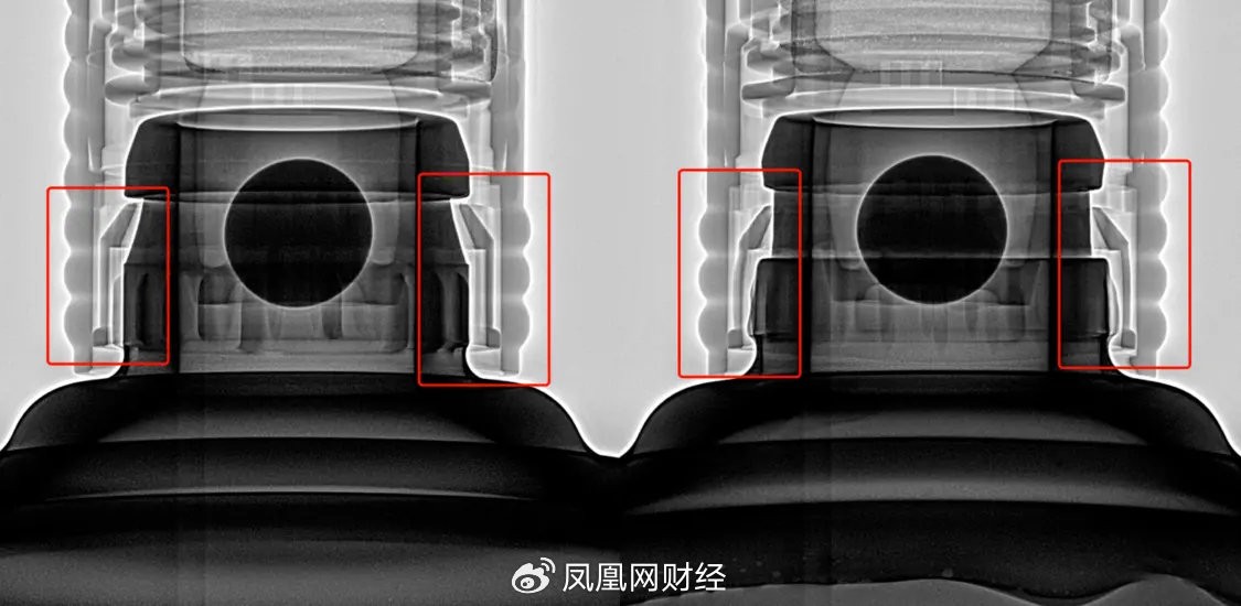 谢智锋介绍,他们检测使用的仪器采用的是 X-ray 技术,原理是利用 X 射线通过物体表面,即时呈现 X 射线穿过物体后的影像,从而实现鉴定,“就像我们去医院照 X 光一样”。茅台酒是陶瓷瓶和玻璃瓶罐装,但瓶盖是塑料材质,其中有 4 个 “卡扣” 卡在酒瓶凹槽里,这是不可逆的,因为原装出厂的茅台酒,瓶盖是一次成型的,卡扣不会变形,而 “拔头” 酒,通过各种方式将瓶盖拔开,卡扣就会出现不同程度的变形。