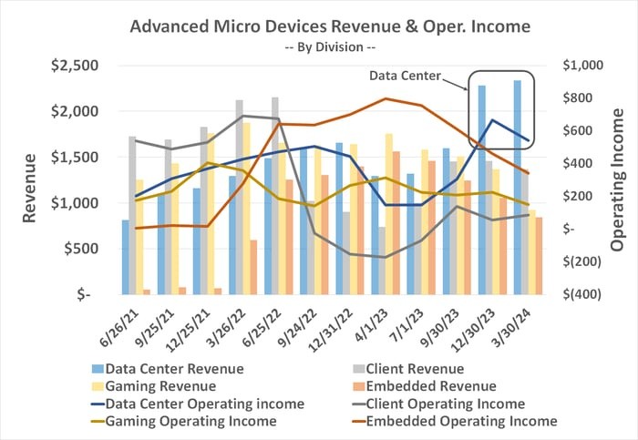 第一张图表乍一看似乎复杂,但实际上并非如此。它只是比较了 AMD 的各业务线(数据中心、游戏、嵌入式和客户端)随时间的发展情况。柱状图代表收入,折线代表营业收入;每个业务的收入和营业收入也有颜色对应。