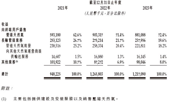 2021-2023 年,五洲能源向工業終端用户銷售管道天然氣的收益分別約為 5.23 億元、8.14 億元及 7.86 億元,佔向終端用户銷售管道天然氣總收益約 88.2%、90.1% 及 89.2%。五洲能源之所以在 2022 年能夠實現 “大邁步”,主要得益於長葛特許經營區域新增從事有色金屬冶煉及壓制、鍊鋼及鋼圈生產的工業終端用户,使其銷氣量增加,同時還有因採購成本上升而導致售價上升的因素存在。而在 2023 年,這一部分業績的波動主要也因長葛特許經營區域內多家從事有色金屬冶煉及壓制以及涉獵製藥行業的工業終端用户消費量下降。