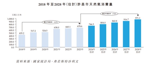 對於在河南省深耕,以銷氣為主業的五洲能源而言,擁有 30 年特許經營權無疑是其保有穩定經營 20 年的 “定海神針”。弗若斯特沙利文報告顯示,未來,許昌市天然氣消費量預計將持續增加並於 2028 年達到 9.71 億立方米,自 2023 年起的複合年增長率為 7.4%。