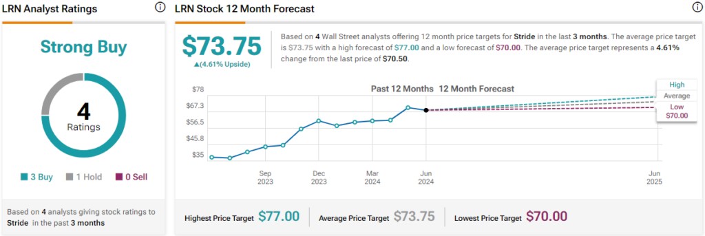 根據四位分析師的建議和最近發佈的價格目標,Stride 被評為強烈買入。LRN 股票的平均目標價格為 73.75 美元,相對於當前水平上漲 4.61%。