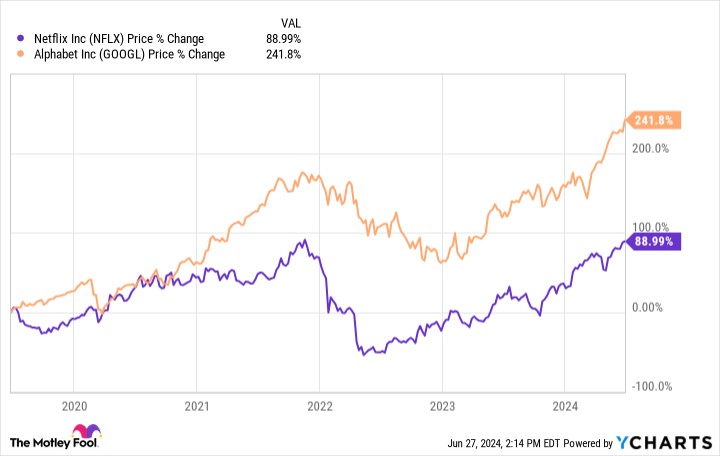 However, over the last five years, Alphabet has dramatically outperformed Netflix. That came at a time when Netflix's competitors made strides against the streaming leader. Now, amid its new, ad-supported option, its double-digit revenue growth has returned.