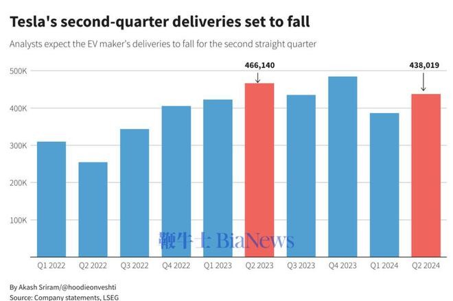 此外,據路透社報道,特斯拉 6 月份季度交付量可能下降 3.7%,這將是首次連續兩個季度出現下滑,因為它面臨着中國市場的激烈競爭,而且由於缺乏價格實惠的新車型導致需求放緩。