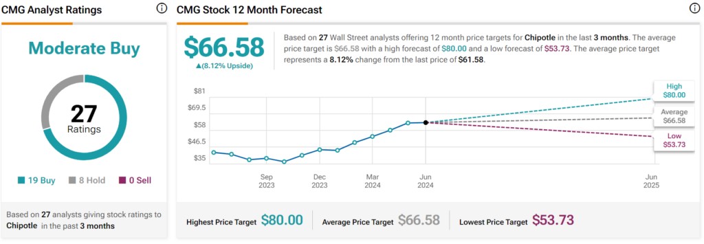 Overall, Wall Street analysts have a Moderate Buy consensus rating on CMG stock based on 19 Buys, eight Holds, and zero Sells assigned in the past three months, as indicated by the graphic below. After a 45% rally in its share price over the past year, the average CMG price target of $66.58 per share implies 8.12% upside potential.
