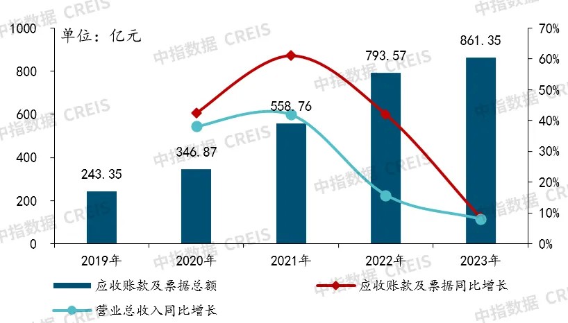 In 2023, the total amount of accounts receivable and notes of listed property service companies reached 86.135 billion yuan, an 8.54% year-on-year increase, significantly down by 33.48 percentage points from the previous year. The difference between the growth rates of accounts receivable and revenue has also decreased significantly by 25.63 percentage points compared to the previous year, indicating relatively controllable growth rates.