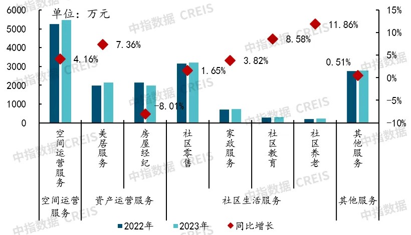 In the community value-added services of the top 100 enterprises, space operation services, asset operation services, and community life services remain the main components, with average revenues in 2023 of 54.688 million yuan, 41.208 million yuan, and 44.704 million yuan respectively, accounting for a total of 84.7% of community value-added service revenue. Among them, space operation services mainly include parking operation, advertising placement or leasing, and other businesses, with a year-on-year growth of 4.16%.