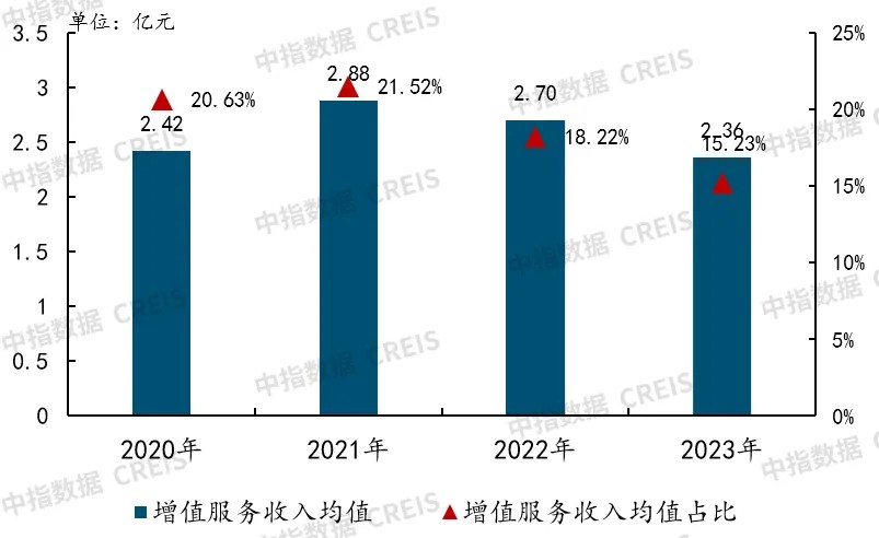 In 2023, the average value-added service revenue of the top 100 enterprises was 236 million yuan, a decrease of 12.59% from the previous year's 270 million yuan, accounting for 15.23%, a decrease of 2.99 percentage points from the previous year. On one hand, the average revenue of non-owner value-added services was 70 million yuan, a decrease of over 30% from the previous year's 105 million yuan, which is the main reason for the decline in value-added service revenue. It is expected that this business will further shrink. On the other hand, constrained by the overall consumption environment, residents' lower income expectations, consumption downgrading, and other factors have led to no significant growth in demand. The average revenue of community value-added services was 166 million yuan, basically unchanged from the previous year, and a significant boost in business is still awaited.