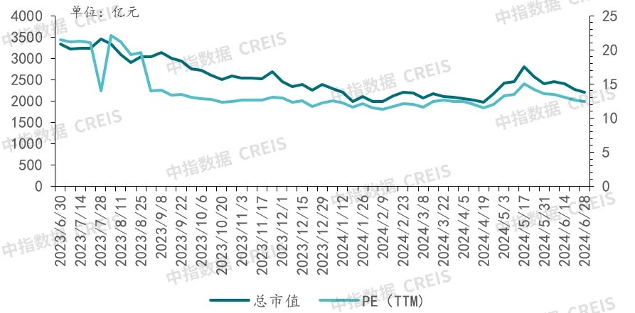 In the first half of 2024, the Hong Kong property sector slightly stabilized, especially since mid to late April, A-shares were influenced by factors such as the "Nine Articles" policy stimulus and favorable policies for related-party real estate, as well as inflow of international funds into Hong Kong stocks, leading to a continuous rebound and a slight increase from the lowest point. As of June 28, 2024, there are a total of 67 listed companies in the industry, including 61 on the Hong Kong main board and 6 on the A-share market, with a total market value of approximately 221.85 billion yuan and an average PE of 12.44 (excluding negative values) Chart: Total market value and P/E ratio of the property sector from June 30, 2023 to June 28, 2024