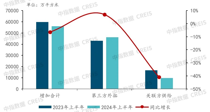 In the first half of 2024, the total newly added contract area of the top 50 companies ranked by new contract area was approximately 560 million square meters, a year-on-year decrease of 6.38%. Among them, the total management area supply from related parties was 98.36 million square meters, a year-on-year decrease of 40.96%, while the management area from third-party expansion was 461 million square meters, a year-on-year increase of 6.98%.