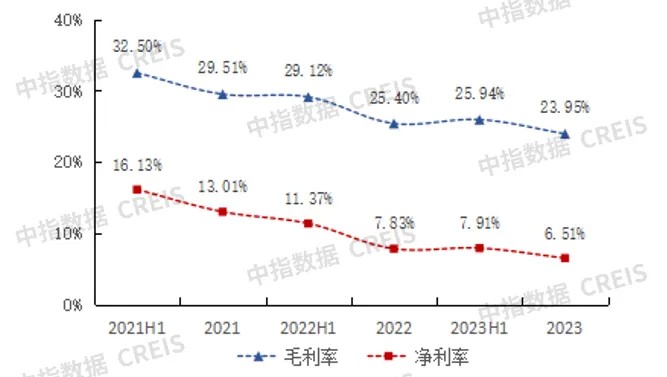 In the first half of 2024, against the backdrop of deep adjustments in upstream industries, property companies' high-margin businesses represented by non-owner value-added services continued to shrink. Coupled with the fact that the exploration effects of most companies' "second curve" were not significant, the overall industry profit margin will continue to return to the level of basic services. The average gross profit margin of property companies listed on the Hong Kong Stock Exchange decreased from 29.51% in 2021 to 25.40% in 2022, further declining to 23.95% in 2023; during the same period, the average net profit margin decreased from 13.01% to 7.83%, further adjusting to 6.51%. It is expected that in the first half of 2024, the profit margin level of property companies listed on the Hong Kong Stock Exchange will achieve a bottoming out and stabilization Chart: Average gross profit margin and net profit margin of Hong Kong-listed physical enterprises from 2021H1 to 2023