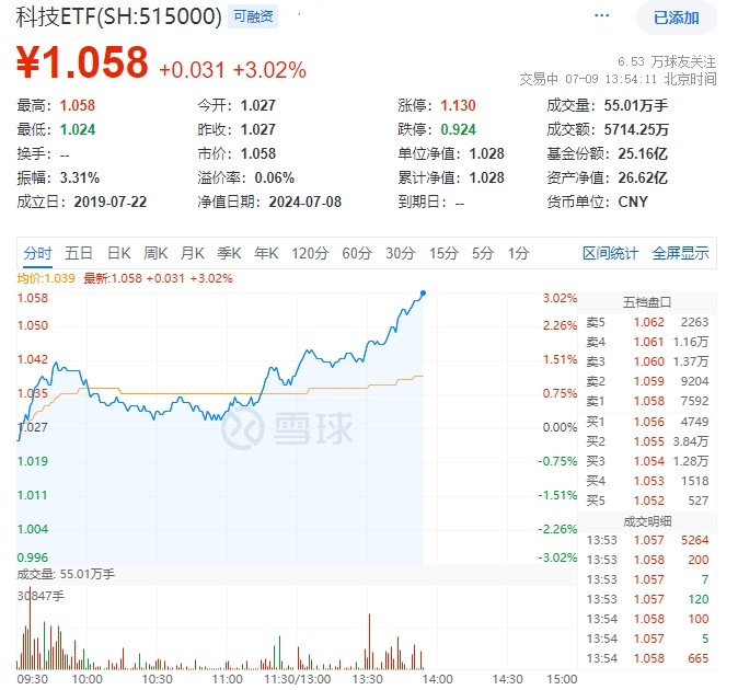 熱門 ETF 方面,代表 A 股科技龍頭行情的科技 ETF(515000)午後漲幅持續擴大,現場內價格上漲 3%,成交額放量超 5600 萬元。