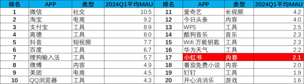 Image: Spring 2024 user scale TOP1 APP monthly active list, Source: Questmobile compilation