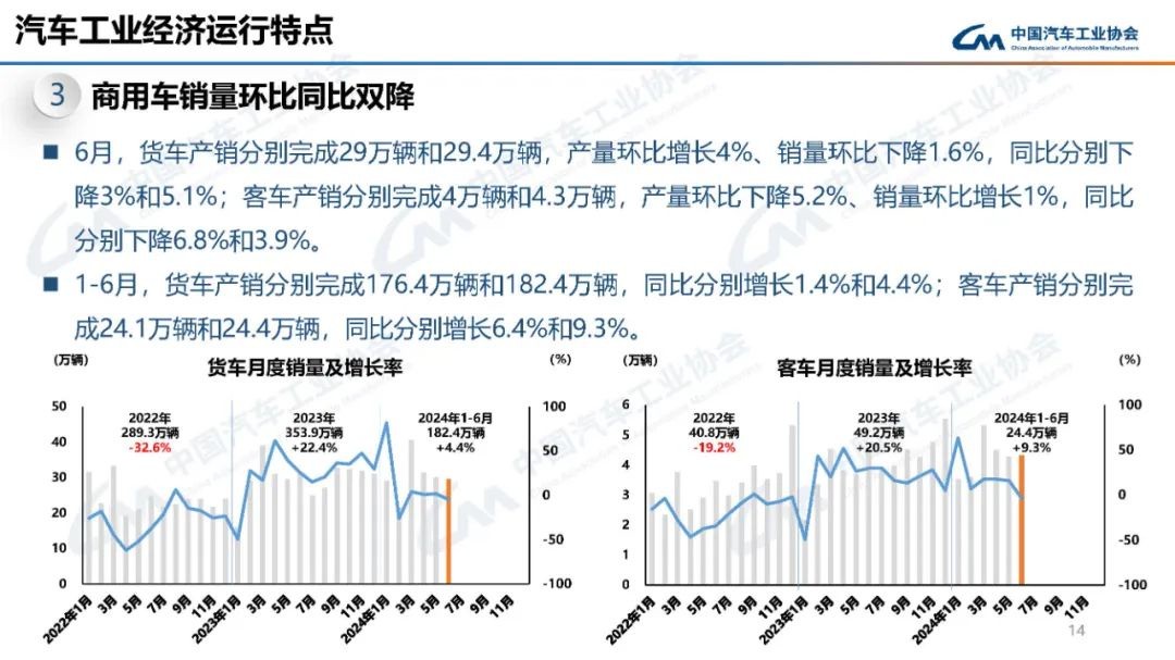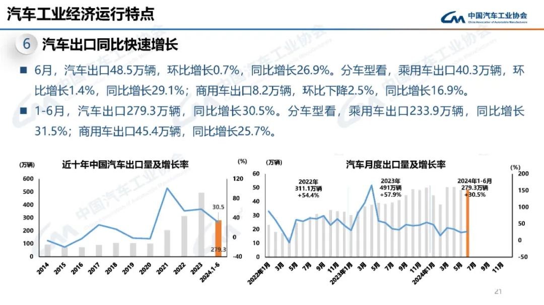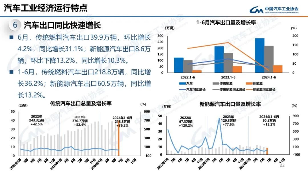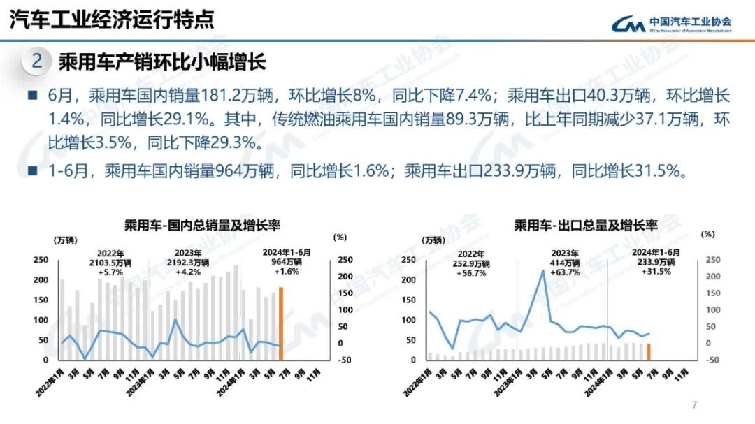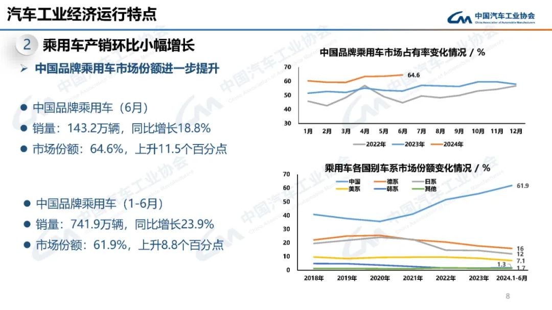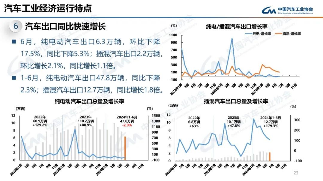 According to the analysis of the China Association of Automobile Manufacturers, since the beginning of this year, the main economic indicators of the automobile industry have shown a growth trend. Due to the relatively low base in the same period of the first quarter, the growth rate exceeded double digits, and the overall growth rate slowed down in the second quarter compared to the first quarter. In the first half of the year, domestic sales increased slightly year-on-year, with terminal inventory higher than normal levels; automobile exports maintained rapid growth, making a significant contribution to driving overall market growth, while the export growth rate of new energy vehicles slowed significantly; the production and sales of new energy vehicles continued to grow rapidly, with a steady increase in market share. According to the association's statistics, as of the end of June this year, the cumulative production and sales of domestically produced new energy vehicles exceeded 30 million units; Chinese brand passenger car market share exceeded 60%, achieving an upward breakthrough.
