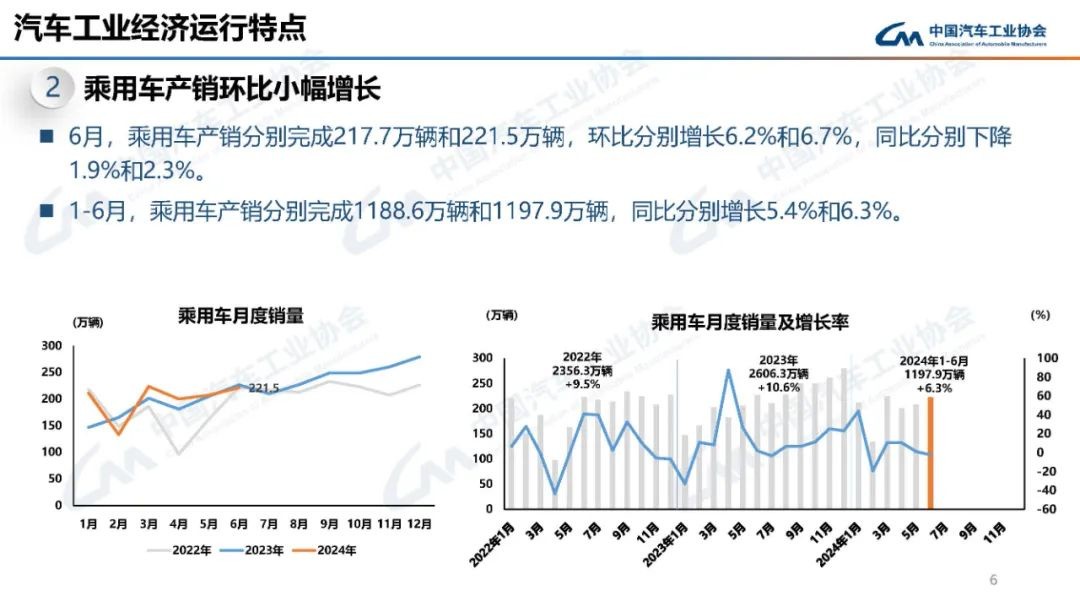 According to the information from Zhitong Finance and Economics APP, on July 10th, based on data from the China Association of Automobile Manufacturers, in June, the production and sales of automobiles were 2.507 million and 2.552 million respectively, with month-on-month growth of 5.7% and 5.6% respectively, and year-on-year decreases of 2.1% and 2.7% respectively. From January to June, the production and sales of automobiles were 13.891 million and 14.047 million respectively, with year-on-year growth of 4.9% and 6.1% respectively. The growth rates of production and sales narrowed by 1.7 and 2.2 percentage points respectively compared to January to May.