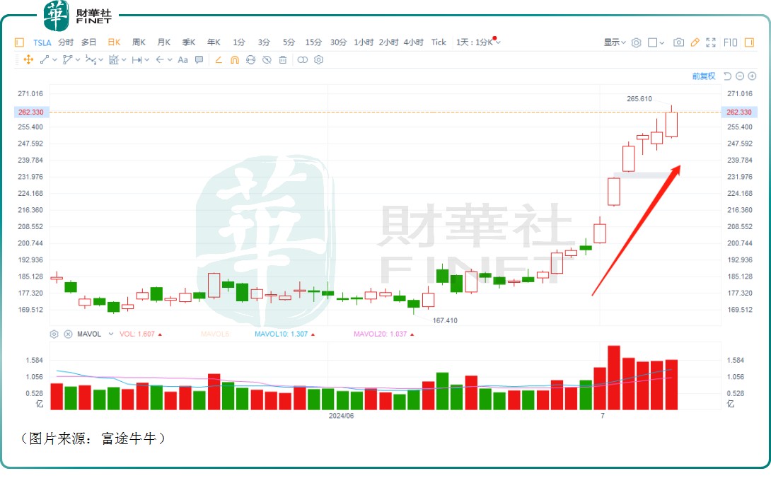 近期特斯拉(TSLA.US)取得 “十连涨” 成就,股价在 10个交易日内飙升了 43.68%。