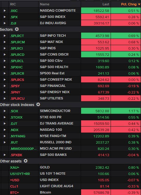 與近期交易相似,標普 500 指數上漲,而大型科技相關股將納斯達克推至首位。