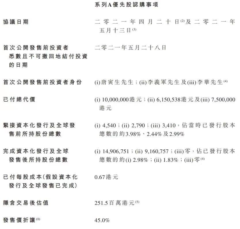 In addition, the company completed a Series A preferred stock subscription before its IPO, with the final completion date in May 2021, at a cost of HKD 0.67 per share, implying a post-transaction valuation of HKD 252 million, a 45% discount to the offering price. Based on the closing price on July 10th, Tang Yinsheng, Li Yijun, and Li Hua have all earned a return of 100%.