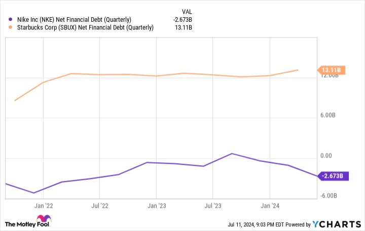 一家公司的資產負債表是其財務健康狀況的重要快照。值得注意的是,耐克擁有 27 億美元的淨現金,與星巴克 131 億美元的淨債務形成鮮明對比。令人印象深刻的是,耐克的淨現金頭寸同比增長了 498%,而星巴克的淨債務則下降了約 8%。