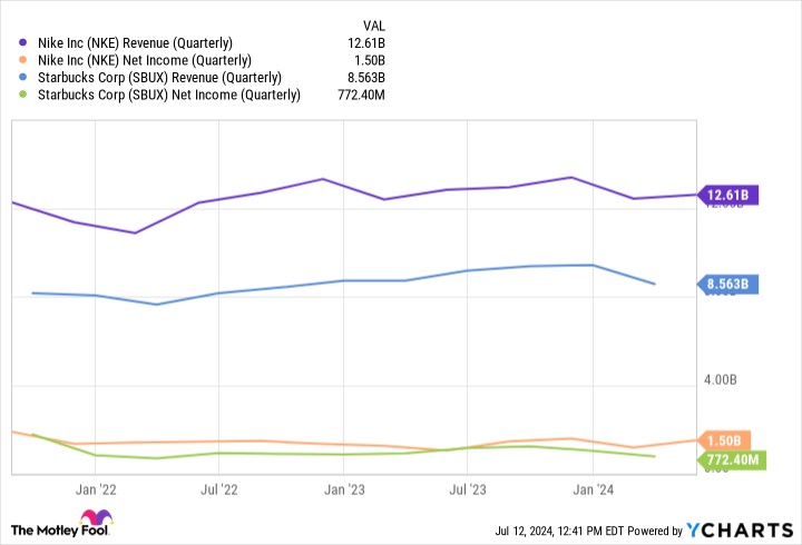 從每家公司的淨利潤來看,很明顯,耐克在最近報告的季度實現了 15 億美元的淨利潤,同比增長 45%,部分原因是其成功將毛利率提高了 1.1%。相比之下,星巴克在其 2024 財年第二季度實現了 7.72 億美元的淨利潤,同比下降 15%。