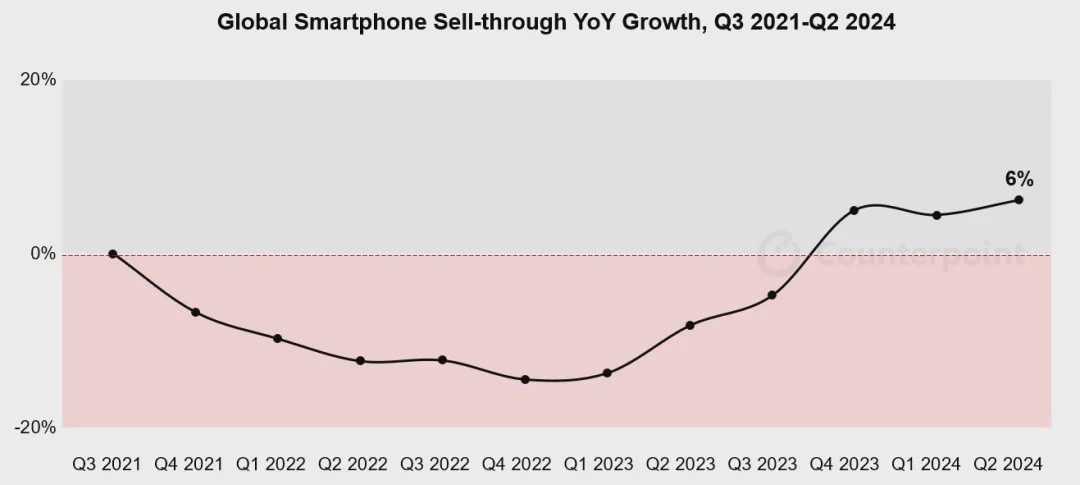 According to preliminary data from Counterpoint Research's Smartphone 360 Monthly Tracker report, global smartphone sales in the second quarter of 2024 increased by 6% year-on-year, marking the highest year-on-year growth rate in three years. This also marks the market's third consecutive quarter of growth.