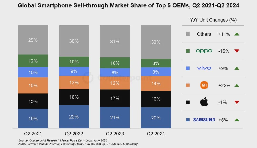 The top five brands remained consistent with the previous few quarters. Samsung maintained its top position, Apple saw a slight year-on-year decline, and Xiaomi experienced the fastest growth among the top five original equipment manufacturers. vivo ranked first in the two largest global smartphone markets, China and India. OPPO followed closely behind in the top five.