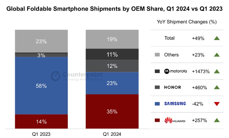 According to Counterpoint Research data, relying on the large foldable screen Mate X5 and the small foldable screen Pocket2, Huawei's shipments in Q1 2024 surged by 257%, with a 19% increase in global market share compared to the same period last year, surpassing Samsung and becoming the global leader in shipments.