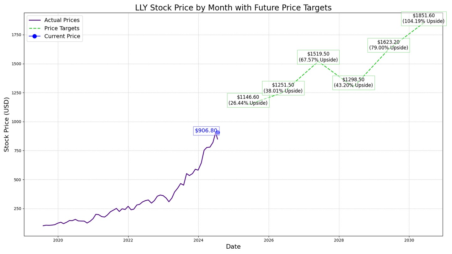 Eli Lilly's stock price has been steadily rising since 2020, increasing by 553% and currently trading at $848.74. The company's market capitalization has also grown from $100 billion to $740 billion. Analysts predict a positive future for Eli Lilly, with projected revenue and net income estimates from 2025 to 2030. The company's success can be attributed to its innovative drug pipeline, strategic acquisitions, and operational efficiency. The current consensus price target for Eli Lilly stock is $898, with some analysts projecting even higher targets.